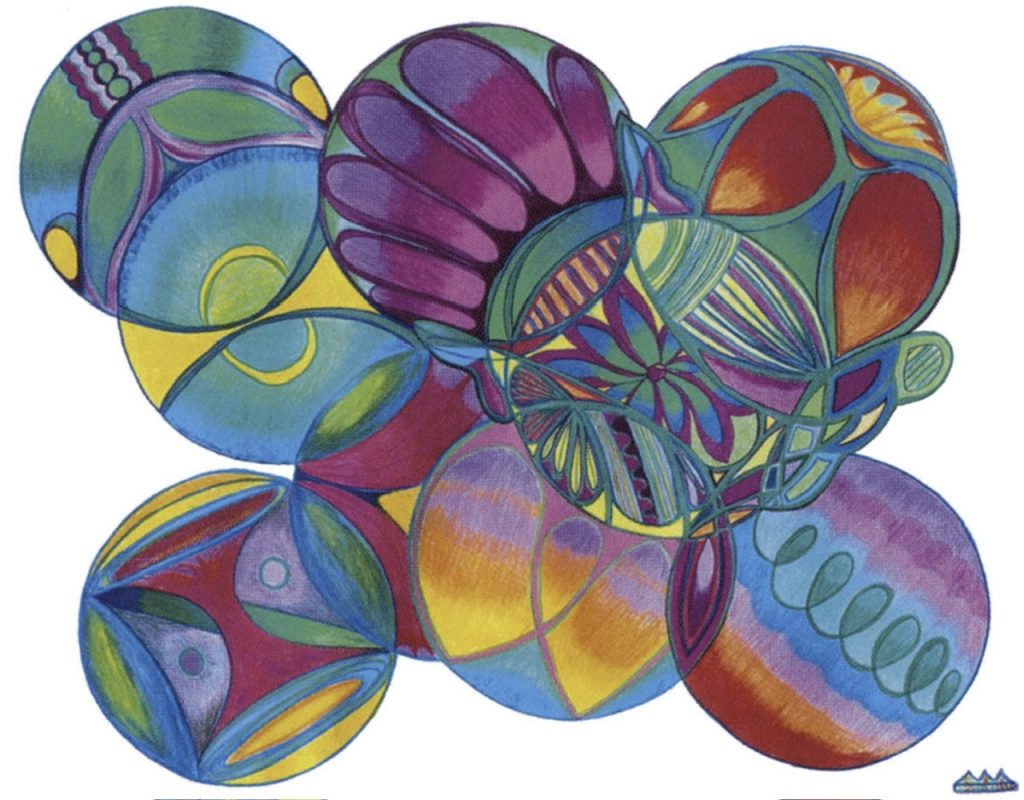 L’œuvre est une composition vibrante de formes circulaires interconnectées, emplies de motifs et de formes abstraites variés. Chaque cercle renferme un ensemble unique de motifs complexes, allant de formes évoquant des pétales à des lignes organiques et fluides qui créent une impression de mouvement et d’harmonie. Les couleurs, riches et variées, comprennent des nuances de bleu, de violet, de jaune, d’orange et de vert, qui se fondent et contrastent pour accentuer la profondeur et la complexité de la composition. L’utilisation de contours marqués contribue à définir chaque forme individuelle tout en préservant la cohésion d’ensemble. L’agencement des cercles suggère une interaction dynamique, presque comme un réseau ou un amas de cellules vivantes, rayonnant d’énergie et de connexion. « La couleur est une énergie, elle a le pouvoir d’harmoniser, de soigner et de guérir » nous apprend l’artiste. « Chaque couleur crée un effet sur le corps, le cœur et l’âme ». L’œuvre témoigne d’une parfaite maîtrise de la théorie des couleurs et de la composition, créant une expérience visuelle stimulante qui invite à une contemplation prolongée.