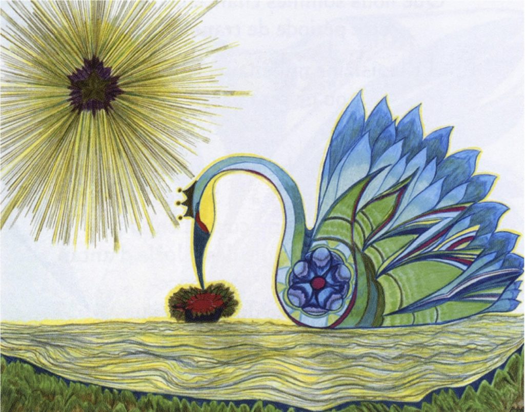Les neuf (9) semaines qu’ont duré le dessin, en tant que libre pratique d’expression artistique, ne sont qu’un des éléments qui ont contribué à une importante prise de conscience personnelle. Intuitivement, avec toute l’ouverture et l’abandon de la personnalité de surface que cela a nécessité, les dessins et les messages ont émergé du monde invisible pour se manifester dans le monde visible. Le passage d’un monde à l’autre a été une sorte de naissance après une gestation métaphysique. L’analogie de la naissance physique après neuf (9) mois de gestation est très présente quand on analyse l’ensemble de cette grande œuvre sur une période de neuf (9) années (1995-2004). L’analyse par l’art de l’herméneutique (cette théorie de la lecture, de l’explication et de l’interprétation des textes qui s’adapte aussi à l’art visuel) apporte ici un double champ d’interprétation: littéraire et artistique. La réflexion philosophique interprétative (l’herméneutique) permet d’aller plus loin. Elle permet de comprendre tout le « non-dit » verbal du message inhérent à son travail intuitif-créatif. Les couleurs ont un langage et une puissance, les symboles aussi. Ils se lisent comme les mots dans un discours. Ne dit-on pas, d’ailleurs, qu’une image vaut mille mots ?