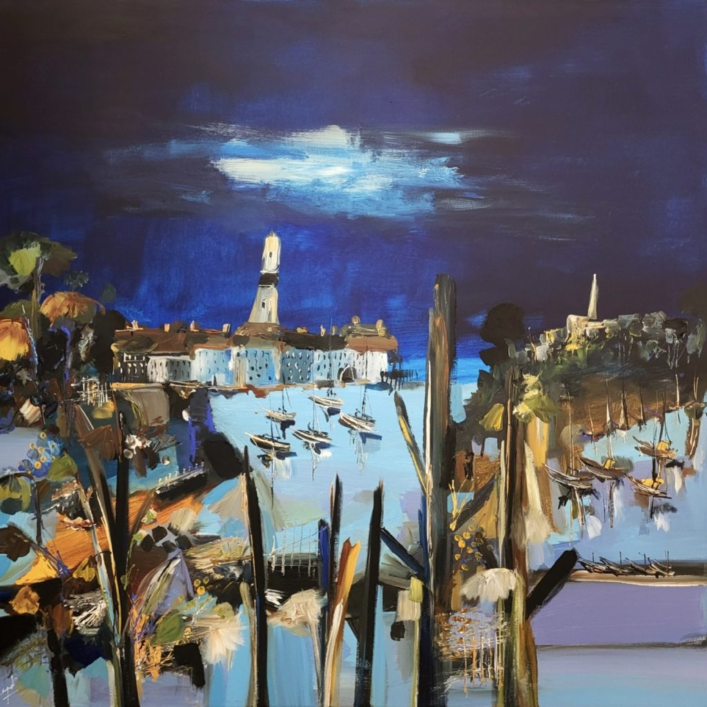 Le port de pêche, très présent dans cette exposition, est représentatif. Il est très symbolique. Il évoque un lieu de pêche et de repos, bien sûr, mais aussi, d’un point de vue psychanalytique une sorte d’anamnèse. Pêcher amène à l’extraction des éléments de l’inconscient, non par une exploration directe et rationnelle, mais en laissant jouer les forces spontanées et en cueillant leurs résultats fortuits. L’inconscient est ici comparé à cette étendue d’eau où sont enfermées les richesses que l’anamnèse et l’analyse ramèneront à la surface, comme le pêcheur des poissons dans ses filets. De nombreuses peintures de Muriel Cayet évoquent ces ports de pêche aux eaux tranquilles sous un ciel bleu. D’ailleurs le bleu est la couleur dominante de cette exposition. Elle est la plus profonde des couleurs. Le regard s’y enfonce sans jamais rencontrer d’obstacle et s’y perd à l’infini. C’est une couleur immatérielle et, dans la nature, on la perçoit habituellement transparente. Le bleu est la plus froide des couleurs et, dans sa valeur absolue, la plus pure. Elle est assurément symbolique. Elle évoque l’espace autant physique qu’intérieur. Les mouvements et les sons, comme les formes, disparaissent dans le bleu, s’y noient, s’y évanouissent, s’y déplacent comme les oiseaux dans le ciel. Le bleu est le chemin de l’infinitude. Il est la couleur de la rêverie et quand il s’assombrit, il devient celle du rêve. La nuit succédant tout naturellement au jour. L’exposition « Refuges Saltimbanques » n’évoque pas un refuge physique, mais un état intérieur: la mer comme horizon mental, la répétition des ports comme un rituel de liberté, la peinture comme geste quotidien nécessaire à l’équilibre intérieur, etc.